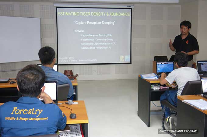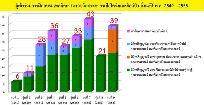 By the earnest effort based on statistic and scientific knowledge, the study results become valuable and useful source for outsider as well as the people in wildlife science concerns who may contribute our current studies to either practical use or further research in the relevant field. The Wildlife Conservation Society (WCS) Thailand Program, together with Khao Nang Rum Wildlife Research Station (KNR) therefore granted the New Generations of Wildlife Biologist Training on Tiger and Wildlife Monitoring Techniques project for the target groups of university students, researchers and scholars who are interested in science and technology which are applicable into wildlife and its population research field. The training consists of two sessions; field training (e.g. practice on map reading, GPS using, patrol data form usage etc.) and software operation training (e.g. practice on patrol database management by using program SMART, data analysis by using program CAPTURE-RECAPTURE and Presence etc.). This project has been continuously performed since 2006. Until now, we have altogether 244 participants who have passed the trainings. Most participated students are from Faculty of Forestry, Kasetsart University (KU). Under the Thai structure, the KU students are the almost the sole group of people being recruited to work as the Forest Technical Officer level at DNP. Many of them now have become wildlife professionals for the government.