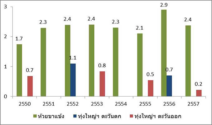 If assumed that whole WEFCOM has the same environment like core areas, the estimated number of adult tiger would be approximately 100 individuals. However, trend or distinct dynamic of tiger can be identify due to a study in HKK is more continued than TY. Moreover, tiger populations are now still changing in a better way as more number of new tiger was photographed each year.