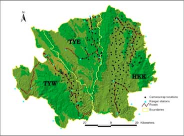 During 2004-2014, tiger population monitoring has been executed by setting up camera traps systematically throughout HKK-TY where accessibility is possible. Setting up camera traps in HKK annually whereas in TY alternate year.