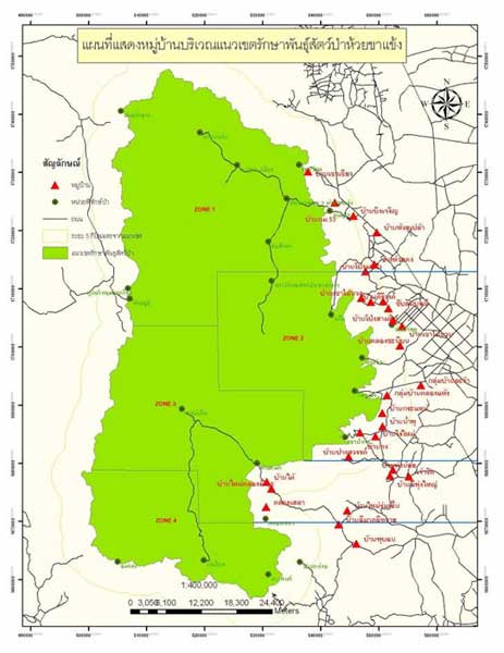HKK does not have any villages inside its boundary but along the eastern side of HKK are 29 villages located within three kilometers from the sanctuary boundary. All of the village areas cover 3 Amphoes (district) are Lansak , Huai-kot and Banrai, 7 Tambon (sub-district) are Rabam , Po-oa, Thaonlang, Kokkawa, Chaowat , Kanmakrut and Banrai. In the population of 29 villages, there are about 4,589 household, with about 17,500 people. (Word Heritage Site Conservation Office 2008)