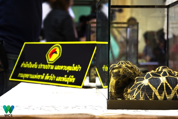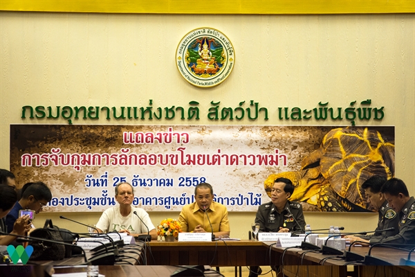 นายธัญญา เนติธรรมกุล รองอธิบดีรักษาการอธิบดีกรมอุทยานแห่งชาติ สัตว์ป่า และพันธุ์พืช พลตำรวจโท ปิยะ สอนตระกูล ผู้ช่วยผู้บัญชาการตำรวจแห่งชาติ และนายสตีเว่น จี แพลท จากสมาคมอนุรักษ์อนุรักษ์สัตว์ป่า (WCS) สาธารณรัฐแห่งสหภาพเมียนมาร์ ร่วมแถลงการจับกุมขบวนการลักลอบค้าเต่าดาว