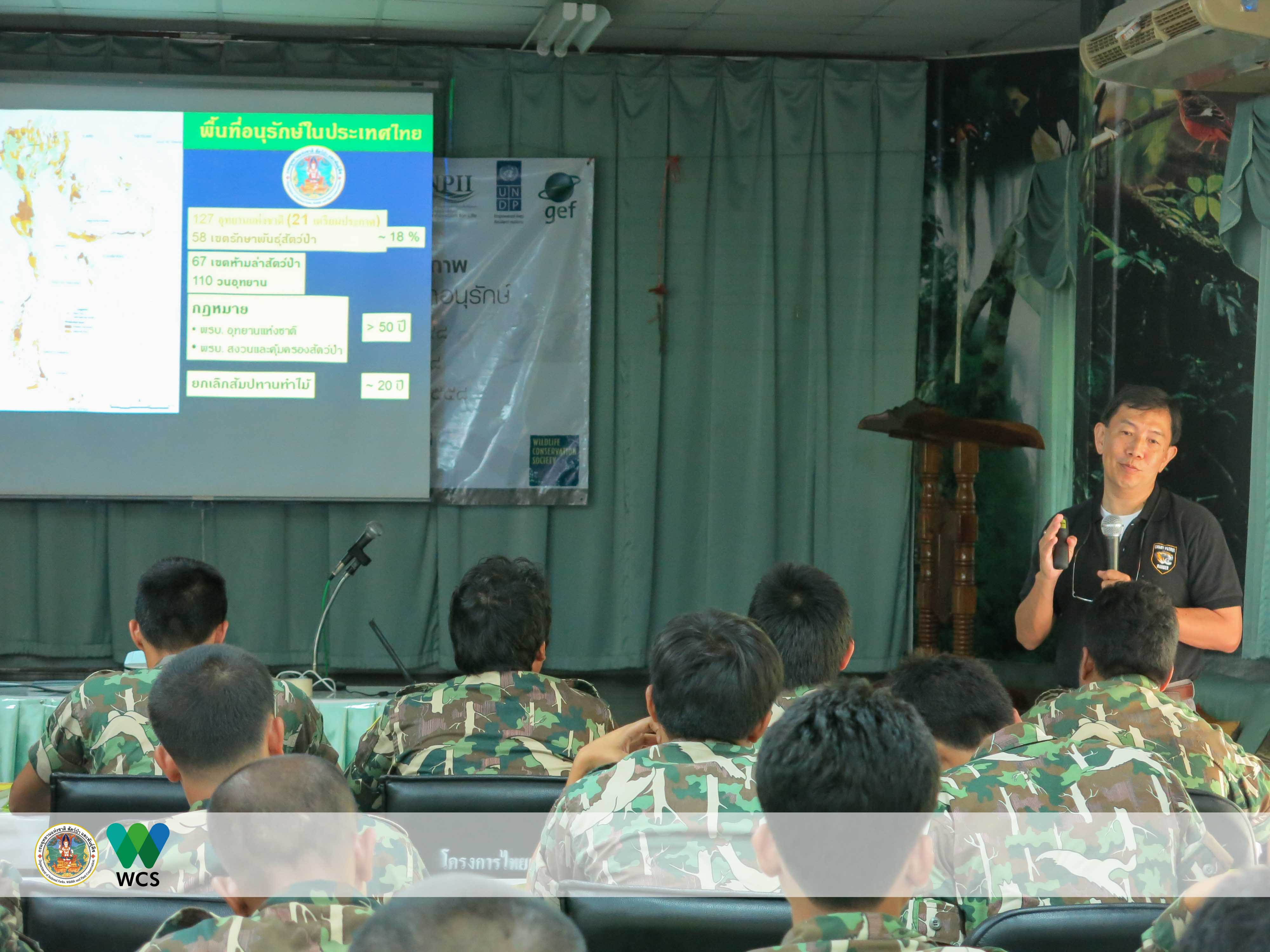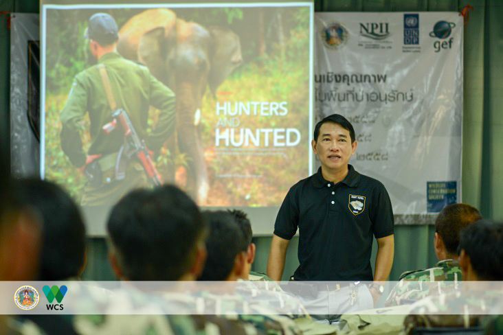 นายสมโภชน์ มณีรัตน์ หัวหน้าเขตรักษาพันธุ์สัตว์ป่าห้วยขาแข้ง บรรยายความสำคัญของระบบการลาดตระเวนเชิงคุณภาพต่อการจัดการพื้นที่คุ้มครอง