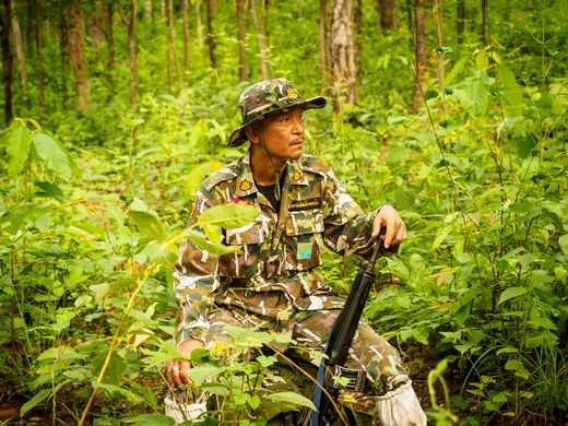 เจ้าหน้าที่เขตรักษาพันธุ์สัตว์ป่าห้วยขาแข้งพร้อมด้วยอาวุธปืน นับว่าเป็นงานที่เสี่ยงต่อชีวิตในการปกป้องสัตว์ป่าจากพรานลักลอบล่าสัตว์ ในพื้นที่คุ้มครองขนาดประมาณ 2,700 ตารางกิโลเมตร ทางตะวันตกของประเทศไทย (ภาพ: Thomas Maresca)