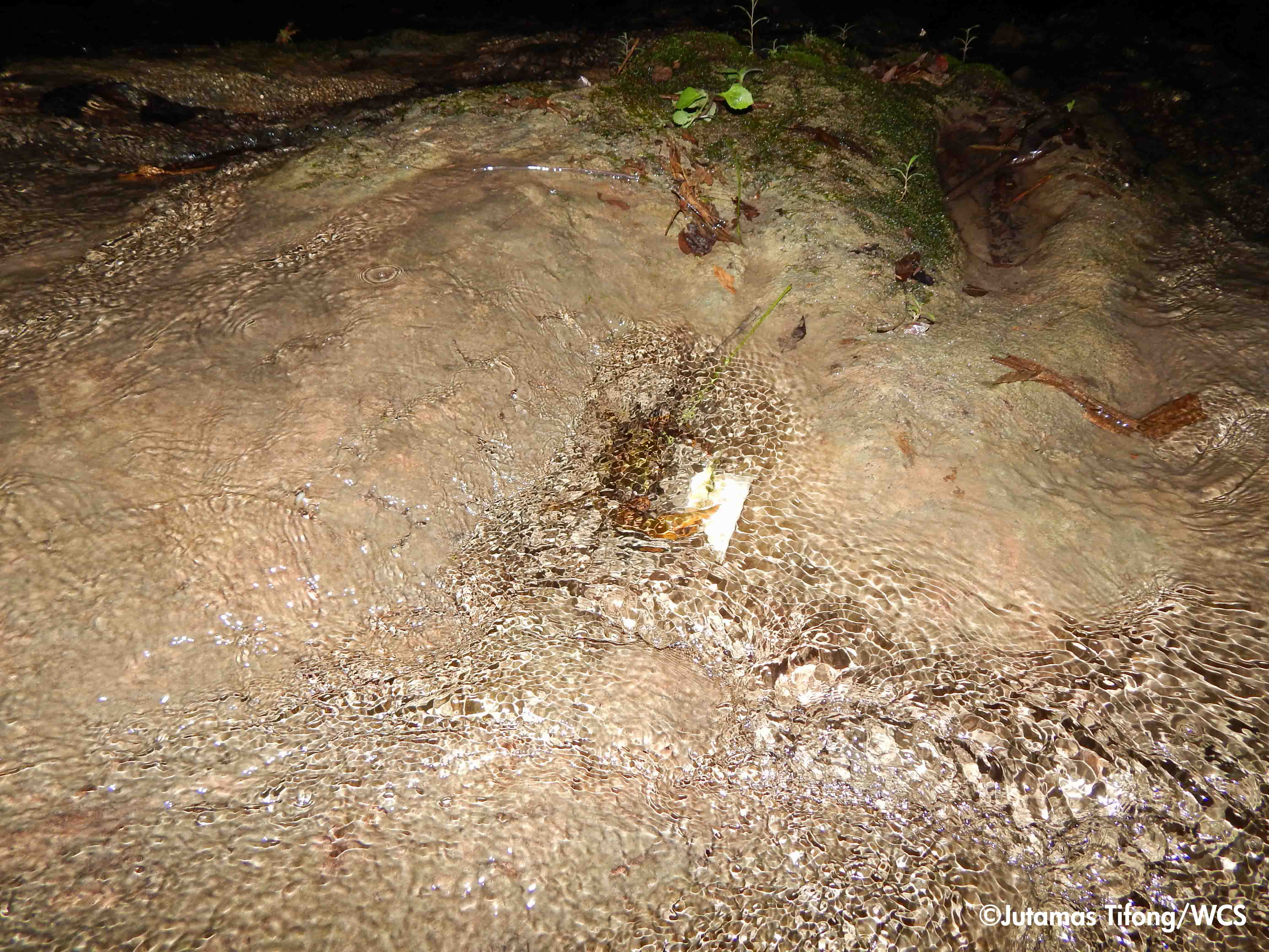 เมื่อได้ตั้งแคมป์พักริมลำห้วยในป่าทีไร เรามักจะได้พบสัตว์ชนิดใดชนิดหนึ่งหรือหลายชนิดในลำห้วยยามค่ำคืนทุกครั้งไป ในช่วงเวลากลางวันสัตว์หลายชนิดมักจะสงบนิ่งเงียบอยู่ในน้ำไม่ปรากฏตัวให้เห็นหรือส่งเสียงร้องให้ได้ยิน มีแต่เสียงน้ำไหลกระทบหินในลำธารเท่านั้น แต่เมื่อแสงเริ่มน้อย น้อยลงจนกระทั่งมืดสนิท โดยเฉพาะยามพลบค่ำสัตว์ป่าเหล่านั้นก็เริ่มปรากฎกาย หรือส่งเสียงร้องแทรกแหวกเสียงน้ำไหลในลำธารขึ้นมา บางครั้งดังมากจนกลบเสียงน้ำไปเสียหมด เสียงร้องนั้นทำให้เราต้องเสาะแสวงหาที่มาของต้นเสียง อุปกรณ์ที่จัดเตรียมเพื่อนำไปค้นหาต้นเสียงมีเพียงอย่างเดียวคือไฟฉาย 1 อันเท่านั้นที่มีแสงสว่างมากพอจนส่องเห็นสิ่งไกล ๆ ได้ชัดเจน หลังจากนั้นเราก็ค่อย ๆ เดินไปตามน้ำที่ไหล เมื่อลงไปในน้ำก็ยิ่งได้ยินเสียงร้องชัดเจนขึ้น เสียงที่เราสนใจมากที่สุด คือเสียงร้องดังคล้ายเสียงสุนัขเห่า ร้องเป็นจังหวะ 6-10 วินาที ก้องไปทั้งเวิ้งน้ำ ระหว่างทางที่ยังค้นหาต้นเสียงไม่พบ สายตาก็เหลือบไปเห็นแสงสะท้อนสีส้มจากน้ำเห็นรูปร่างลาง ๆ อยู่ใต้น้ำ เมื่อส่องไฟฉายไปก็พบกับกุ้งในน้ำมากมายกำลังเดินทวนน้ำขึ้นไปยังต้นน้ำ สังเกตนานเข้าก็เห็นถึงความพยายามของมันที่จะเดินทรงตัวทวนกับกระแสน้ำที่ไหลแรงไปจนถึงยอดห้วยได้ และในจุดใกล้เคียงกัน ก็พบสัตว์อีกชนิดหนึ่งที่กำลังพยายามลากเศษไม้ไผ่ที่เราสับแล้วทิ้งในน้ำเพื่อเอาไปที่ไหนสักแห่ง นั่นก็คือปู เมื่อเราส่องไปที่ตัวมัน มันก็จะพยายามหาที่หลบโดยลงไปอยู่ในที่น้ำลึกและกดตัวต่ำลงแล้วนิ่งที่สุดที่จะทำได้ เมื่อเราพยายามลองเอาไม้แหย่ ๆ ดูจะรู้สึกได้ว่าปูกำลังแข็งขืนกับเราโดยกดตัวเองนิ่งไม่เคลื่อนไหวตามไม้ที่เราพยายามแหย่มัน แต่แล้วเมื่อเราลองเอาไฟฉายออกจากตัวมัน มันก็รีบขยับหนีออกจากที่ตรงนั้นโดยเร็ว นอกจากนี้ระหว่างทางยังพบปลาตัวเล็ก ๆ อีกมากมายที่ปรากฎตัวในยามค่ำคืนทำให้สายน้ำยามมืดมิดแห่งนี้ยังมีชีวิตชีวาเป็นอย่างมาก